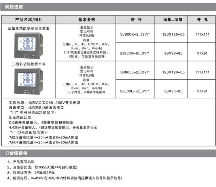 三相多功能谐波表、三相多功能复费率表是针对电力系统、工矿企业、公用设施、智能大厦的电力监控需求而设计的它可以高精度的测量所有的需用电力参数及电能计量和谐波分析;釆用可视度高的LCD来显示仪表测量参数和电网系统运行信息,仪表面板带有编程按键。用户可以现场方便地实现显示切换、参数设置、使用灵活方便。可以直接代替常规电力变送器等辅助単元,作为一种先进的智能化数字化电网前端采集元件,广泛应用于各种控制系统、变电自动化系统、配电自动化系统中,其有安装方便、接线简单、维护方便、工程量小等特点,能够完成业界不同PLC、工业控制计算机通讯软件网。