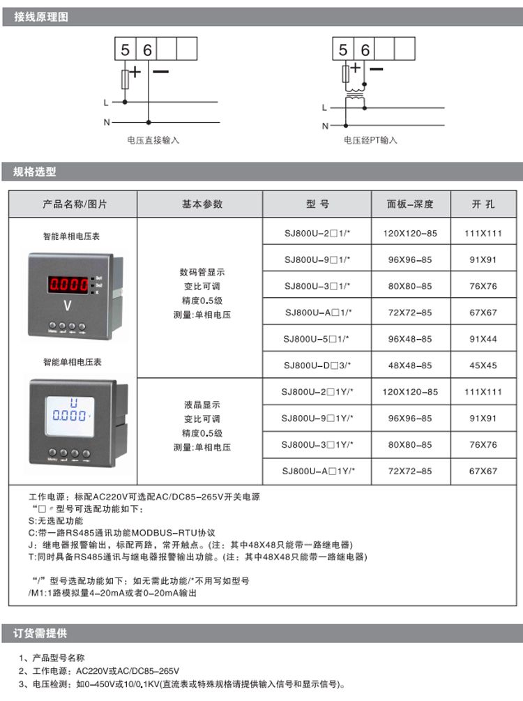 SJ-800智能单相电压表是一种具有可编程、显示、数字通讯功能的电测仪表,采用交流采样技术,可直接或间接测量单相电网中的电流、电压、功率、电能等,可广泛应用变电站自动化、智能建筑、企业内部的电量测量、管理、考核。测量精度为05级、实现现场显示和远程RS485数字接口通讯,采用MODBUS-RTU通讯协议。