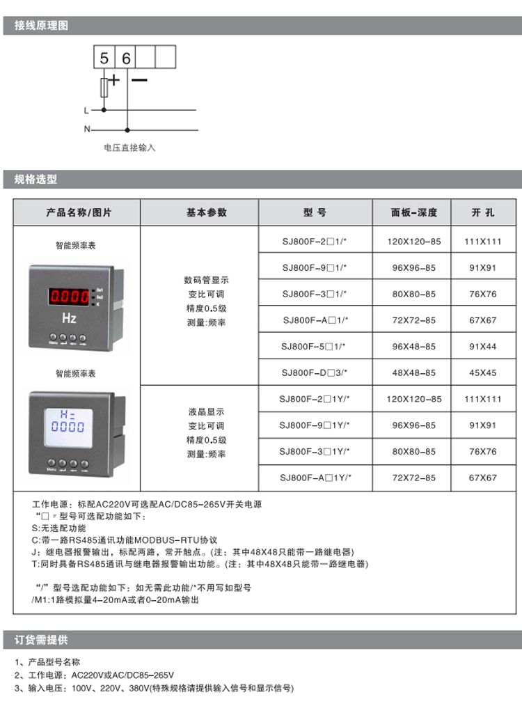 SJ-800智能频率表是一种具有可编程、显示、数字通讯功能的电测仪表,采用交流采样技术,可直接或间接测量单相电网中的电流、电压、功率、电能等,可广泛应用变电站自动化、智能建筑、企业内部的电量测量、管理、考核。测量精度为05级、实现现场显示和远程RS485数字接口通讯,采用MODBUS-RTU通讯协议。